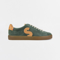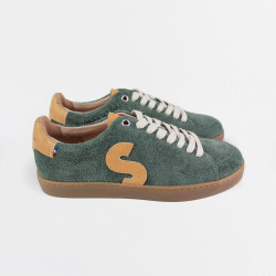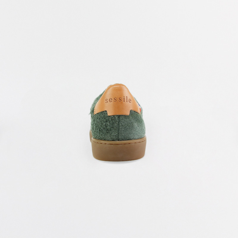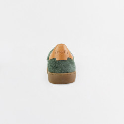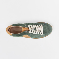 Cette version, chic et naturelle, se distingue par son cuir velours texturé vert sapin. Les touches camel contrastent subtilement avec les semelles miel.