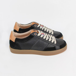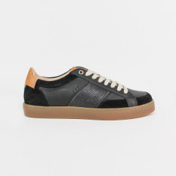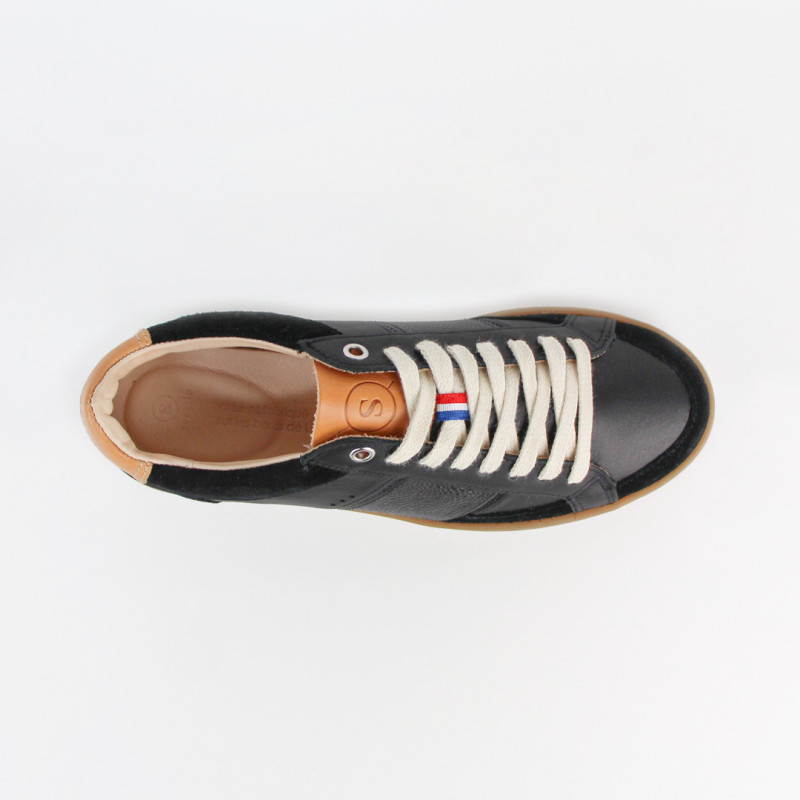 Les détails graphiques de ce modèle de baskets en cuir apportent une esthétique moderne et dynamique, qui ne passera pas inaperçue. Ses cuirs noirs contrastent parfaitement avec la semelle miel. Et petit plus : ses lacets sont en coton biologiques. Ce modèle fait partie de nos iconiques.