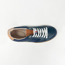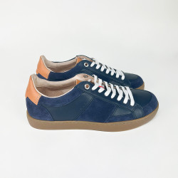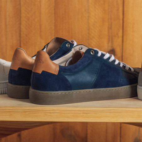 Sublimez votre style avec nos baskets en cuir bleu marine, alliant harmonieusement le cuir lisse et le cuir velours pour une touche d'élégance intemporelle. Combinées avec des semelles couleur miel, ces baskets respirent la sophistication et défient les tendances éphémères. Elles font partie de nos iconiques.