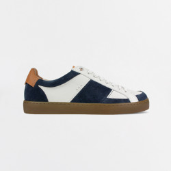 Une basket en cuir qui marie à la perfection sobriété et audace. Sa tige associe un cuir lisse crème raffiné à des empiècements en cuir velours bleu foncé, apportant une profondeur élégante au design. Les détails en cuir camel sur la languette et le talon soulignent son charme intemporel.