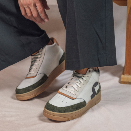 02SUREAU7808Notre modèle de baskets Sureau Crème Marron Kaki est entièrement fabriqué en France.