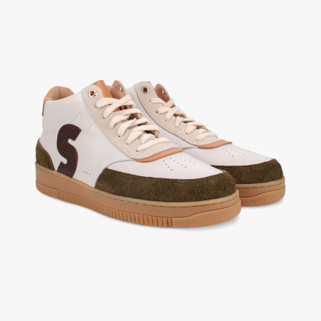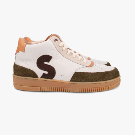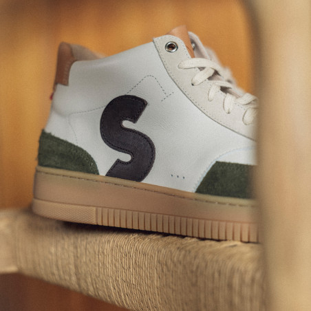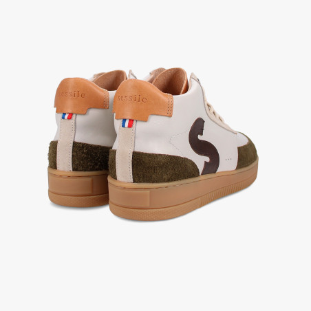 Avec sa tige en cuir lisse crème, ses empiècements en cuir velours texturé kaki et son logo “S” marron, la Sureau Crème Marron Kaki garde l’élégance Sessile tout en ajoutant une touche d’assurance.