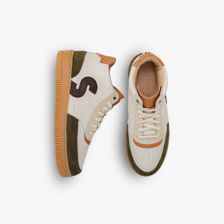 Menu mobile ( compte/contact/boutique)Notre modèle de baskets Sureau Crème Marron Kaki est entièrement fabriqué en France.